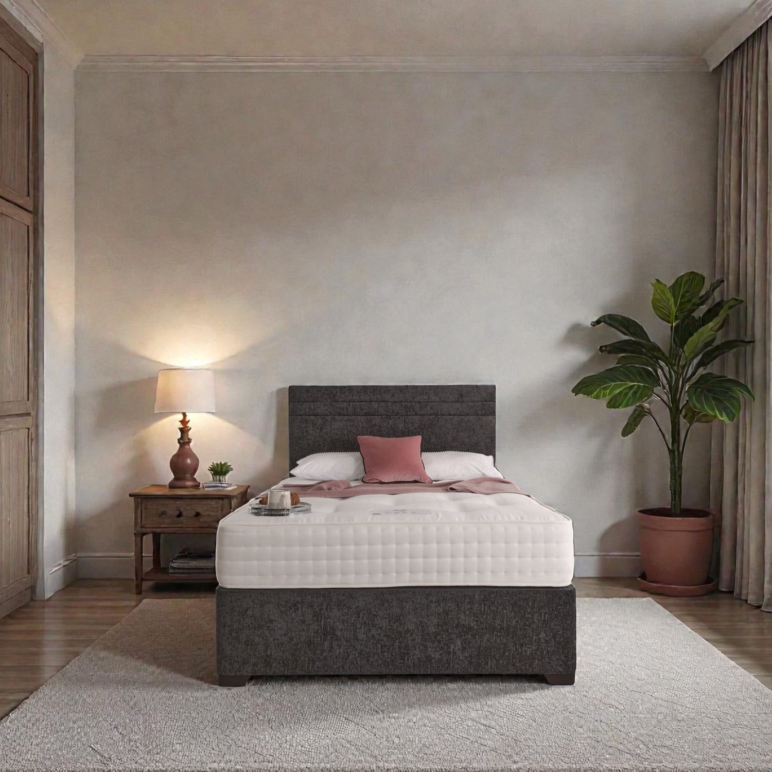 The divan base is finished with chrome effect glider feet and subtle chrome detailing, adding a touch of modern luxury. This set includes a deep filled, strutted upholstered headboard, as shown in the images, with the option to upgrade your bed by selecting a luxury mattress to suit your comfort preference.