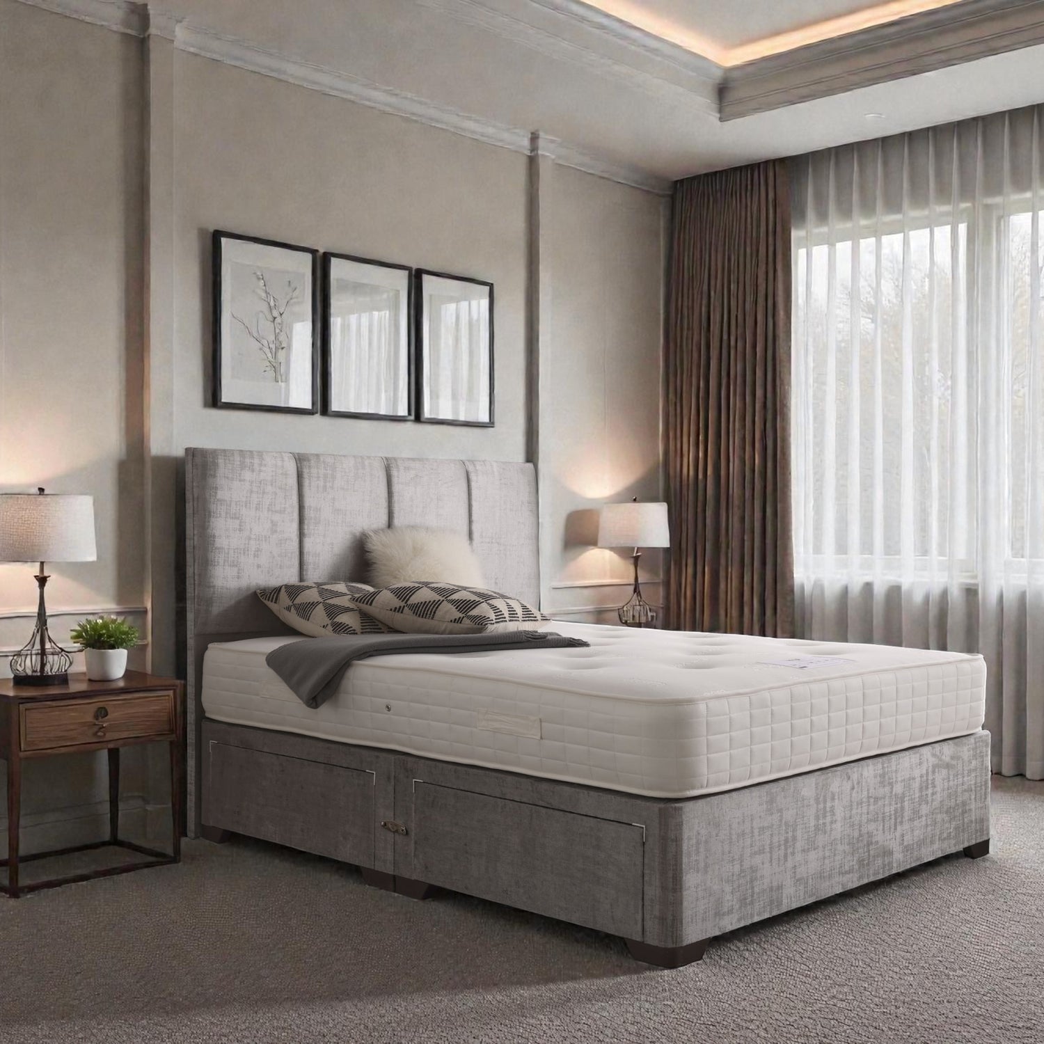 The divan base is finished with chrome effect glider feet and subtle chrome detailing, adding a touch of modern luxury. This set includes a deep filled, strutted upholstered headboard, as shown in the images, with the option to upgrade your bed by selecting a luxury mattress to suit your comfort preference.