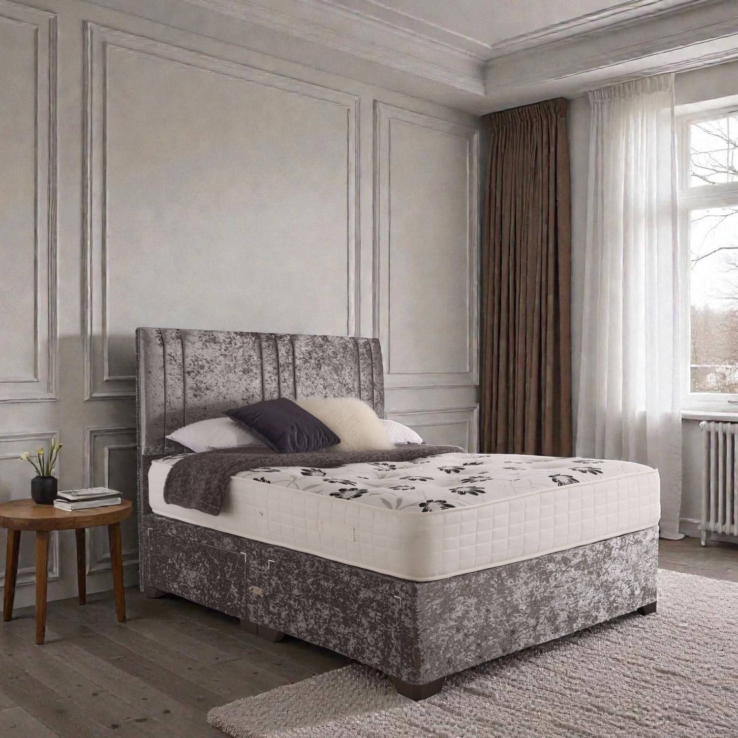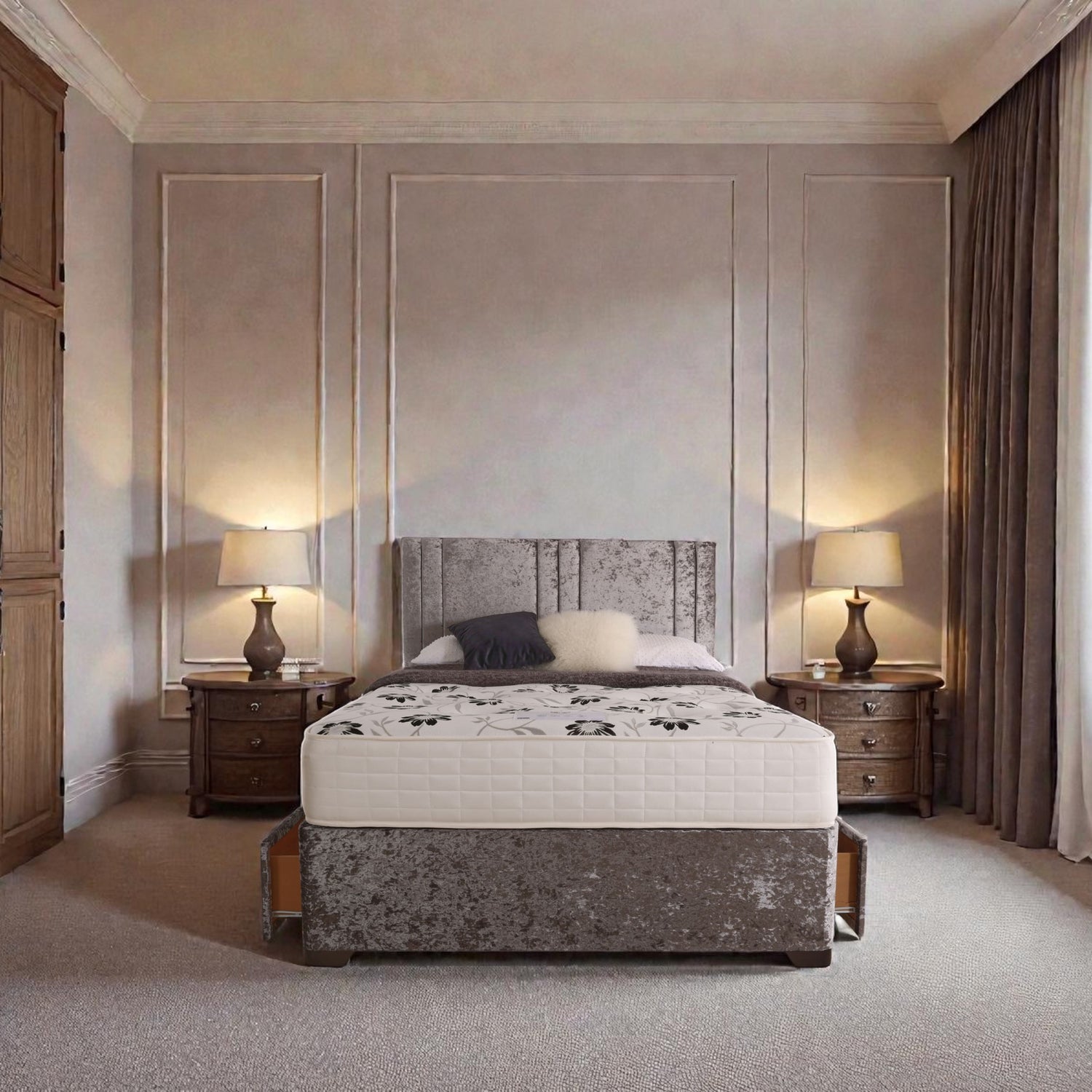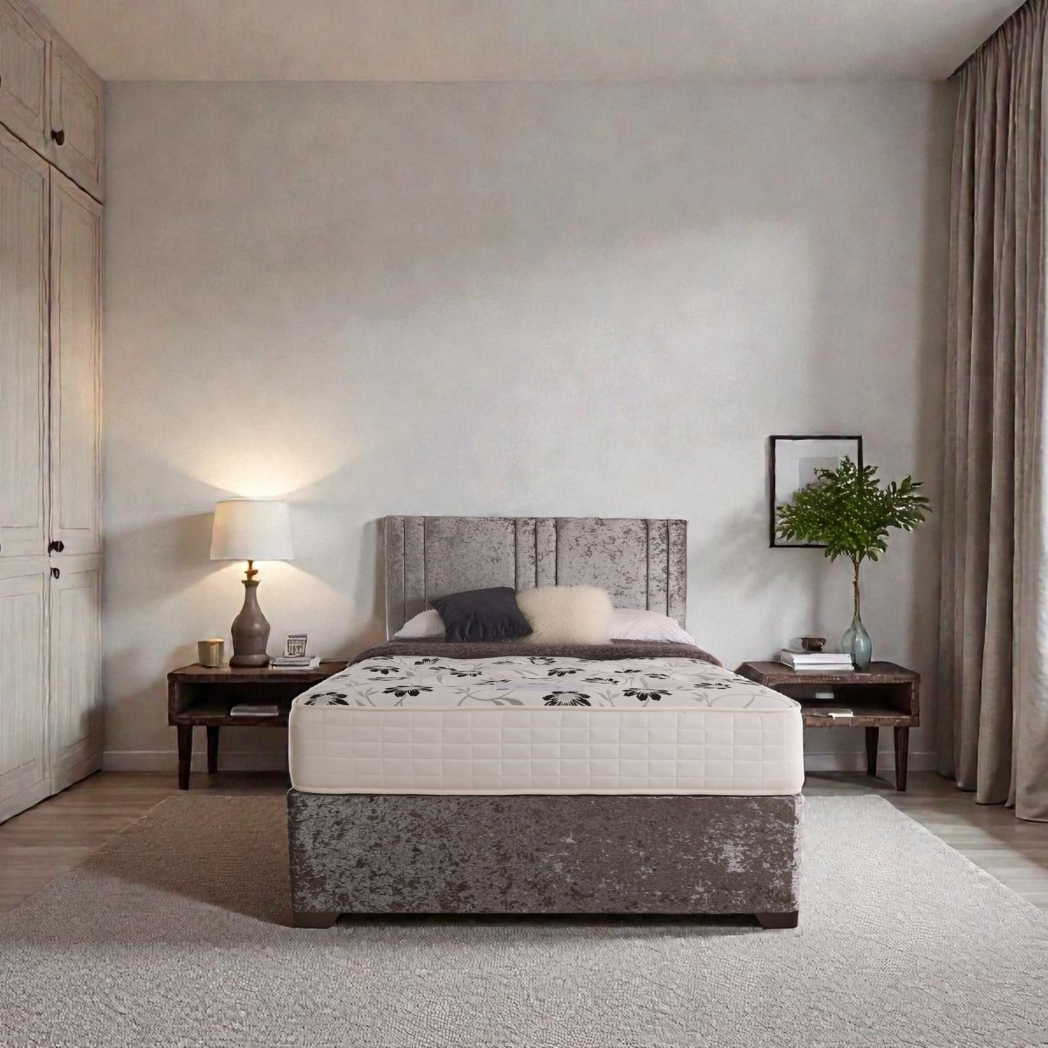 The divan base is finished with chrome effect glider feet and subtle chrome detailing, adding a touch of modern luxury. This set includes a deep filled, strutted upholstered headboard, as shown in the images, with the option to upgrade your bed by selecting a luxury mattress to suit your comfort preference.